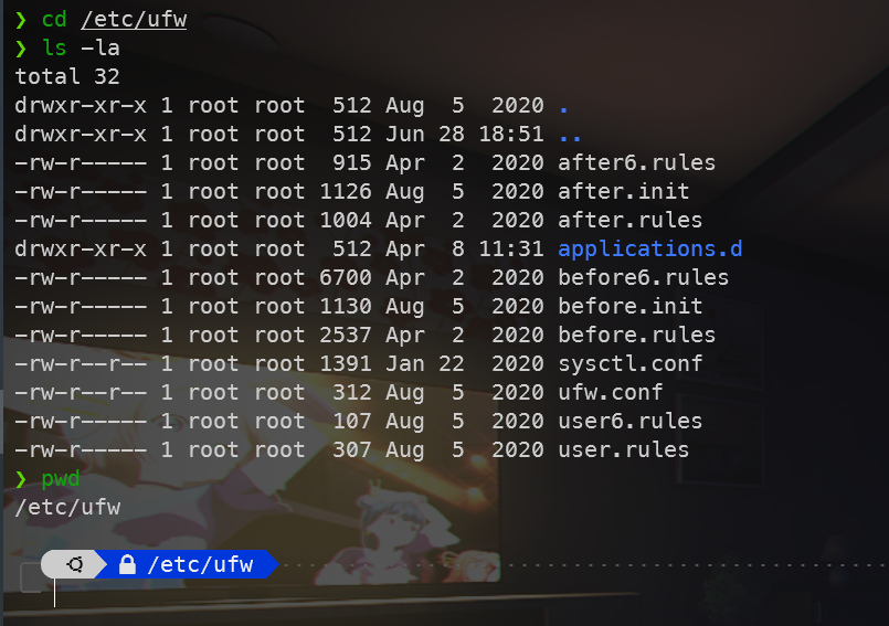 移動到/etc/ufw目錄 並列出詳細資訊和目前目錄路徑